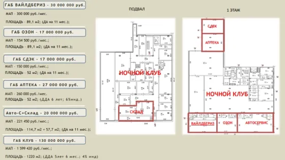 Общий МАП: 2 163 020 руб. Арендаторы: - ночной клуб/бар (ДДА на 10 лет с ежегодным индексацией) - CDEK (ДА 11 мес.) - Планета здоровья (ДДА 6 лет)