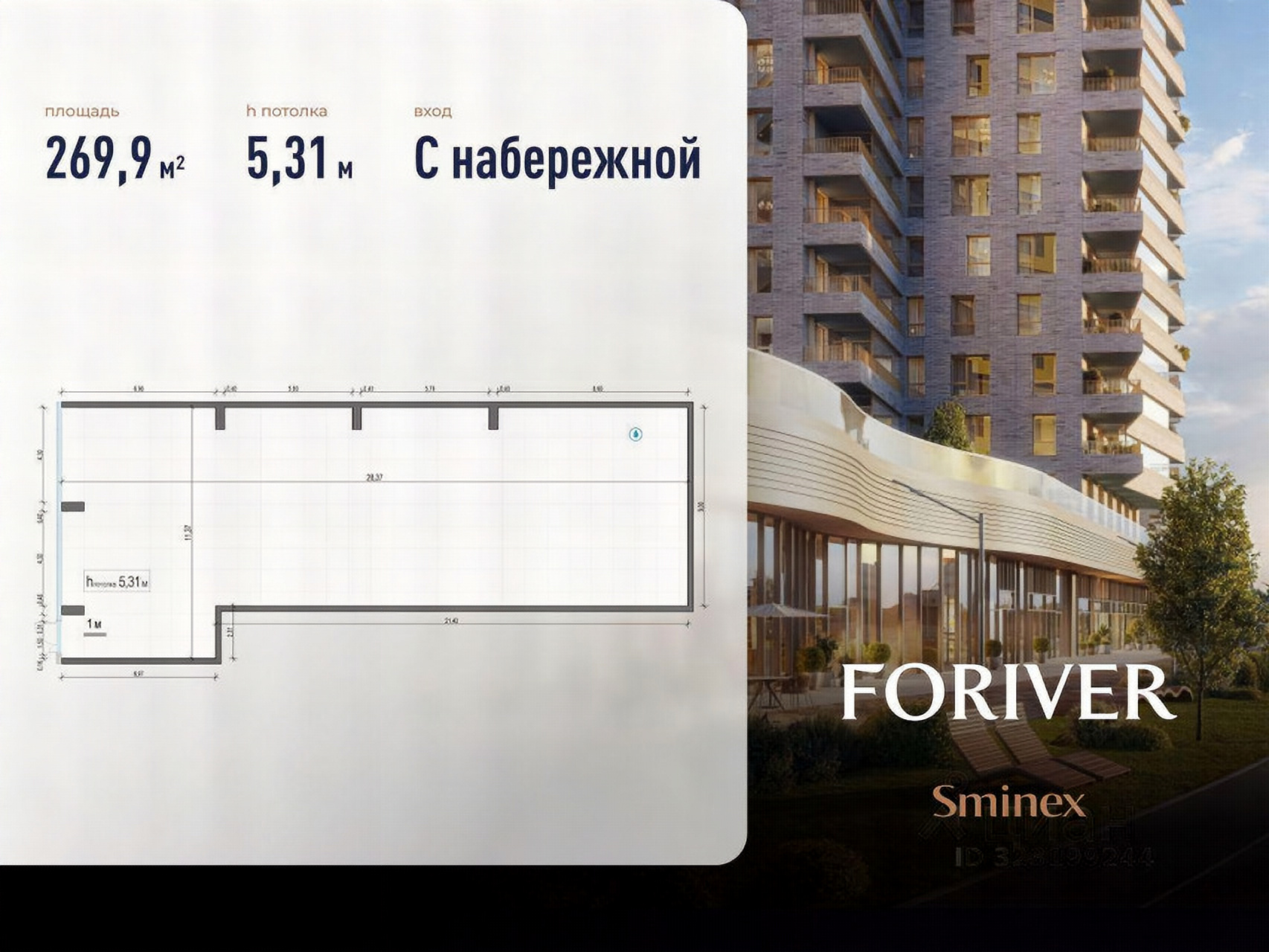 Торговое помещение площадью 269,9 кв.м. в премиальном жилом квартале FORIVER. Расположено на первом этаже жилого корпуса 4, на территории с открытым доступом, имеет прямой выход на набережную, место под рекламную вывеску. В помещении панорамные витрины, высота потолка 5,3 м, мокрая точка. Действует беспроцентная рассрочка. По запросу предоставим фото помещения.