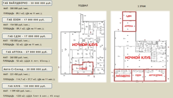 Общий МАП: 2 163 020 руб. Арендаторы: - ночной клуб/бар (ДДА на 10 лет с ежегодным индексацией) - CDEK (ДА 11 мес.) - Планета здоровья (ДДА 6 лет)